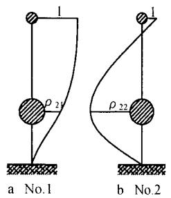 两质点模型的两阶振型 (面内) 如图 2 所示,其中 \rho_{21},\rho_{22} 为振型坐标。两阶振型对应的自振频率由结构动力学的基本公式 \left|[K] - \omega^{2}[M]\right| = 05求得