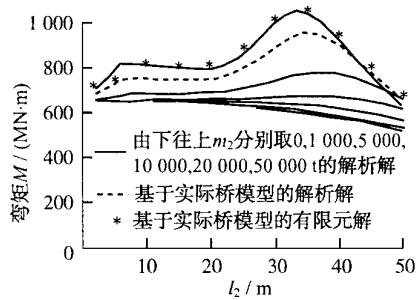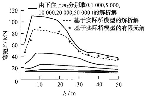 图 6 画出了墩顶位移、墩底弯矩、承台底剪力和承台底弯矩随基础刚度和承台质量变化而变化的规律。在每个图中,6 条实线对应承台质量 m_{2} 分别为 0,1000,5000,10000,20000,50000t 时所反映出的规律,虚线对应的是实际连续钢梁桥方案通过 MATLAB 所得出的解析解,而离散点“*”对应的是实际连续钢梁桥方案通过有限元建模所得出的有限元解。可见,对于高桩承台基础和基础以上的桥梁结构,两质点模型解析解与有限元解反应的规律一致,而且误差较小。