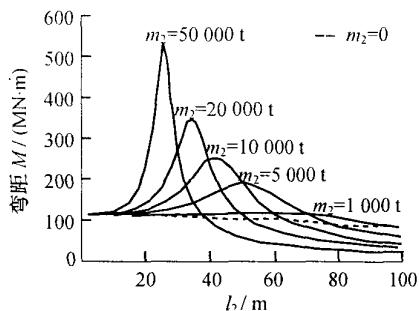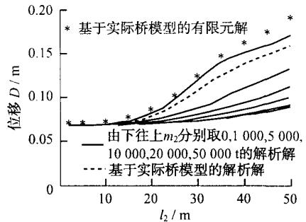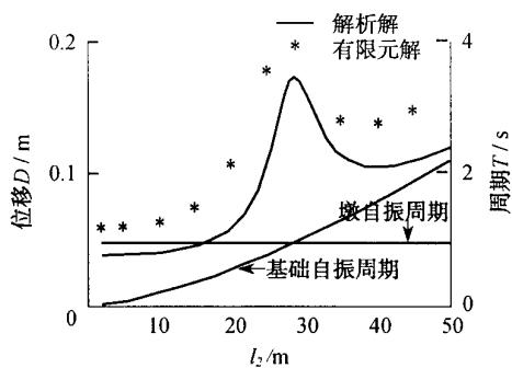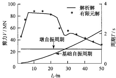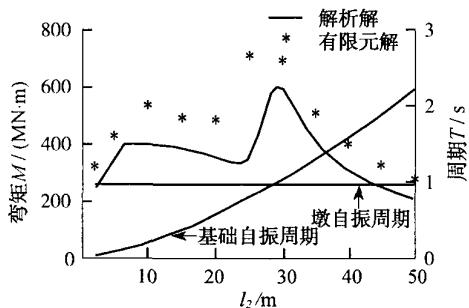对前述两质点模型,采用本文编制的 MATLAB 程序进行了地震反应分析,并通过变化群桩基础水平刚度来改变群桩基础的自振周期,以揭示高桩承台基础与基础以上桥梁结构的动力相互作用规律。同时建立等效嵌固桩长为一些特定值 (l_{2} = 2,5,10,\dots ,50\mathrm{m}) 的有限元模型,并将所算得的结果绘在同一张图上。
