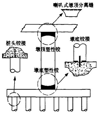 墩底铰接单元一般在墩柱底部截断所有柱中的纵向钢筋,然后在柱中央提供竖向铰钢筋,在墩柱四周放置伸缩缝材料来减少传力键的尺寸,以减少传入基脚和基础中的荷载。对这种构造措施需要注意两点:① 对于多柱式桥墩,若梁墩固结,则允许在墩底铰接,但若为支座支承上部结构,则不适合采用柱底铰接来减少基础地震力;② 在设计中,通常认为这种构造措施是完全铰即抗弯能力为零,而在确定能力,保护的剪切荷载或评价现有桥梁时,应注意此构造仍可传递一定的弯矩,且具备传递相当大剪力的能力。