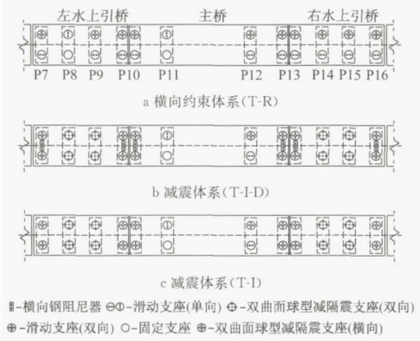 以某近海大跨度钢桁架拱桥为工程背景,主桥为 (80 + 336 + 80)\mathrm{m} 的中承式双层钢桁拱桥,左右各连 3\times 72\mathrm{m} 的钢桁架水上引桥,水上引桥与岸上引桥相连。图 1a 为桥梁正常使用状态下的横向约束体系 (记为 T-R)。图中,\mathrm{P7\sim P16} 表示桥墩编号。该横向约束体系在设计地震下存在的主要抗震问题是:水上引桥各墩、主引桥过渡墩墩底及其基础的需求很大,多数桩基础进入屈服状态,不满足设计规范16的要求。上述问题也是大多数大跨度桥梁在横桥向所面临的共同问题。