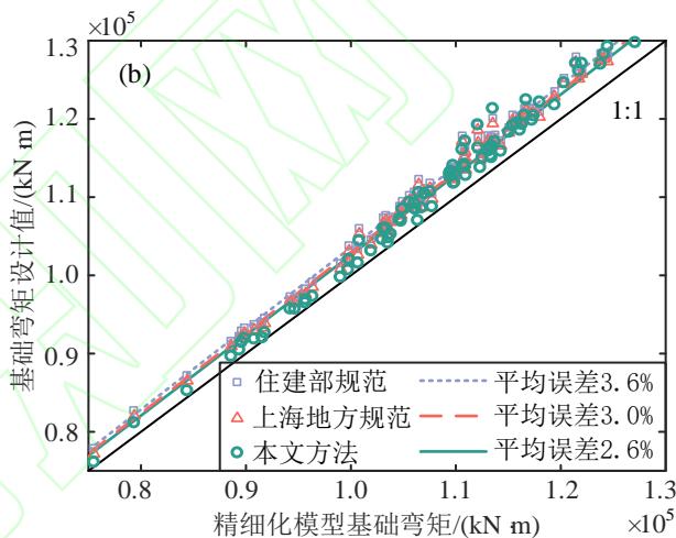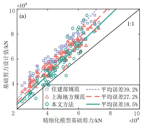 由图 10 可见,与精细化模型结果相比,三种简化方法的结果都是偏大的,特别是基础剪力设计值的结果。规范方法、规范修订方法和本文简化计算方法得到的基础剪力设计值平均误差分别为 39.2\% 、 27.2\% 、 18.5\% ,而基础弯矩设计值的平均误差分别为 3.6\% 、 3.0\% 、 2.6\% 。由于承台底的剪力设计值与桩身弯矩设计值呈正相关关系,而桩身截面抗弯强度又与配筋率呈正相关关系,因此与住建部规范相比,采用本文结果预计可减少桩身配筋率 14.6\% ,与上海市地标相比,可减少桩身配筋率 6.8\% 。