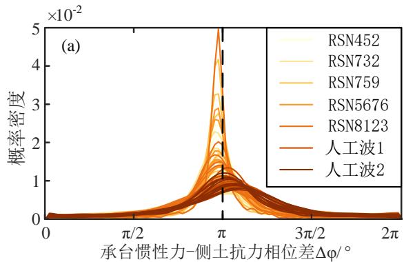 (3)承台的惯性力与侧土抗力之间的相位差在 \pi 附近大致服从正态分布,可近似视为同频反相。