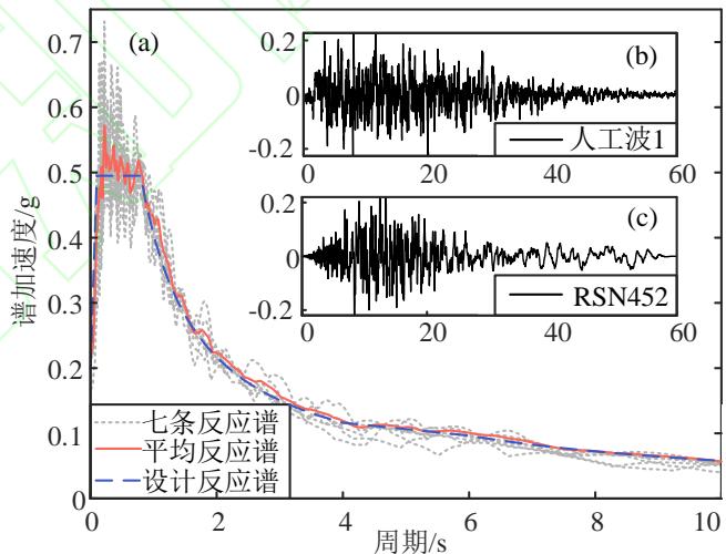 七条地震动时程对应的反应谱和其中两条时程如图 2 所示,平均反应谱与设计反应谱吻合较好。