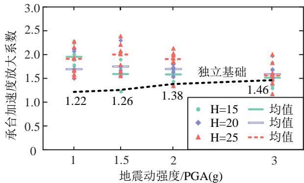 承台最大地震惯性力可由承台质量与加速度峰值的乘积计算得到,因此可以直接研究承台加速度的放大系数(承台峰值加速度反应与输入地震波 PGA 的比值)。图 5 给出了不同墩高工况下承台加速度放大系数随地震动强度的变化规律,并与独立基础(即无桥墩)的结果进行了比较。由图可知,随着地震强度的增大,墩柱逐渐屈服进入塑性且塑性程度不断增大,导致墩柱刚度不断减小,对基础的约束作用也不断减弱,承台的峰值加速度趋近于独立基础的结果,但显著大于地面峰值加速度。各地震强度下,承台加速度放大系数的平均值大于 1.5。