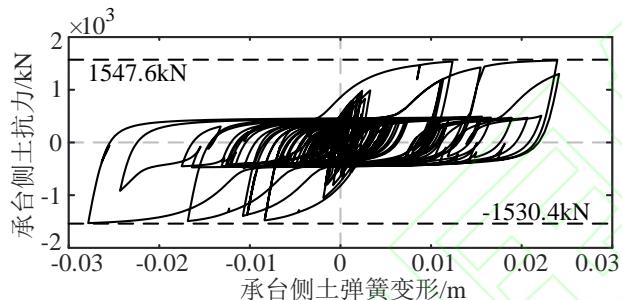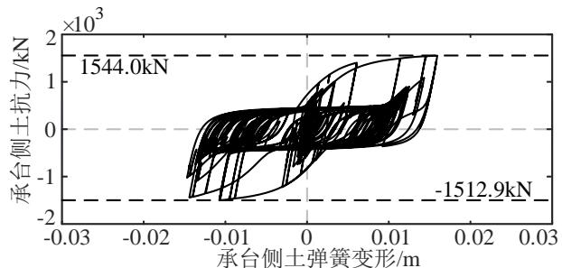 为研究承台侧土抗力的发挥情况,图 6 代表性的给出了以 RSN759 地震波为输入的 E2 工况下,不同墩高模型中承台侧土弹簧的滞回曲线,土弹簧的最大土压力在所有墩高情况下最小为 1483.3\mathrm{kN} ,已发挥至极限值( 1565.26\mathrm{kN} )的 95\% 。