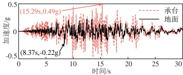 地震输入加速度代表地面加速度,而承台加速度是地震动激起的承台振动所导致的,为了验证承台地震响应与地表地震动之间的关系,图 4 以 RSN759 为输入的 E2 地震工况为例,比较了地面加速度时程和不同墩高下承台的加速度响应。可以看到承台的加速度相对地面加速度有明显放大,且两者的峰值发生在不同时刻,说明两者同步振动2的假设与事实存在较大偏差,因此有必要研究承台最大地震惯性力的规律。