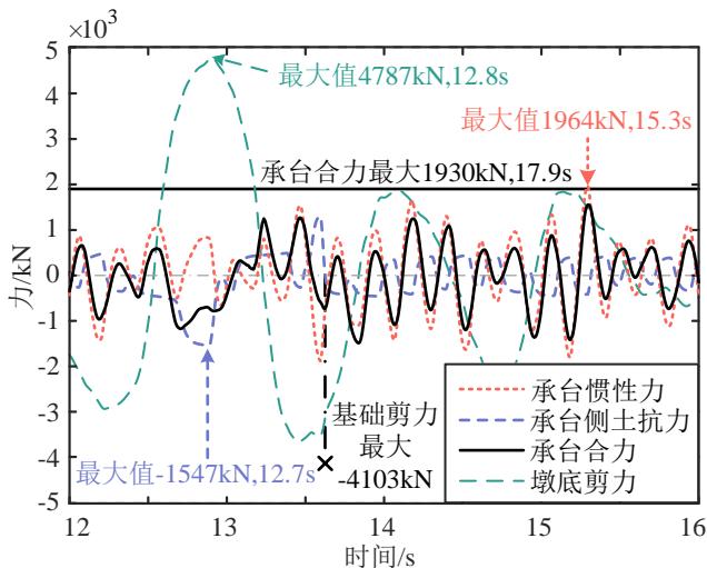 图 8 承台地震响应(承台惯性力、承台侧土抗力及其合力)以及墩底剪力的时程曲线