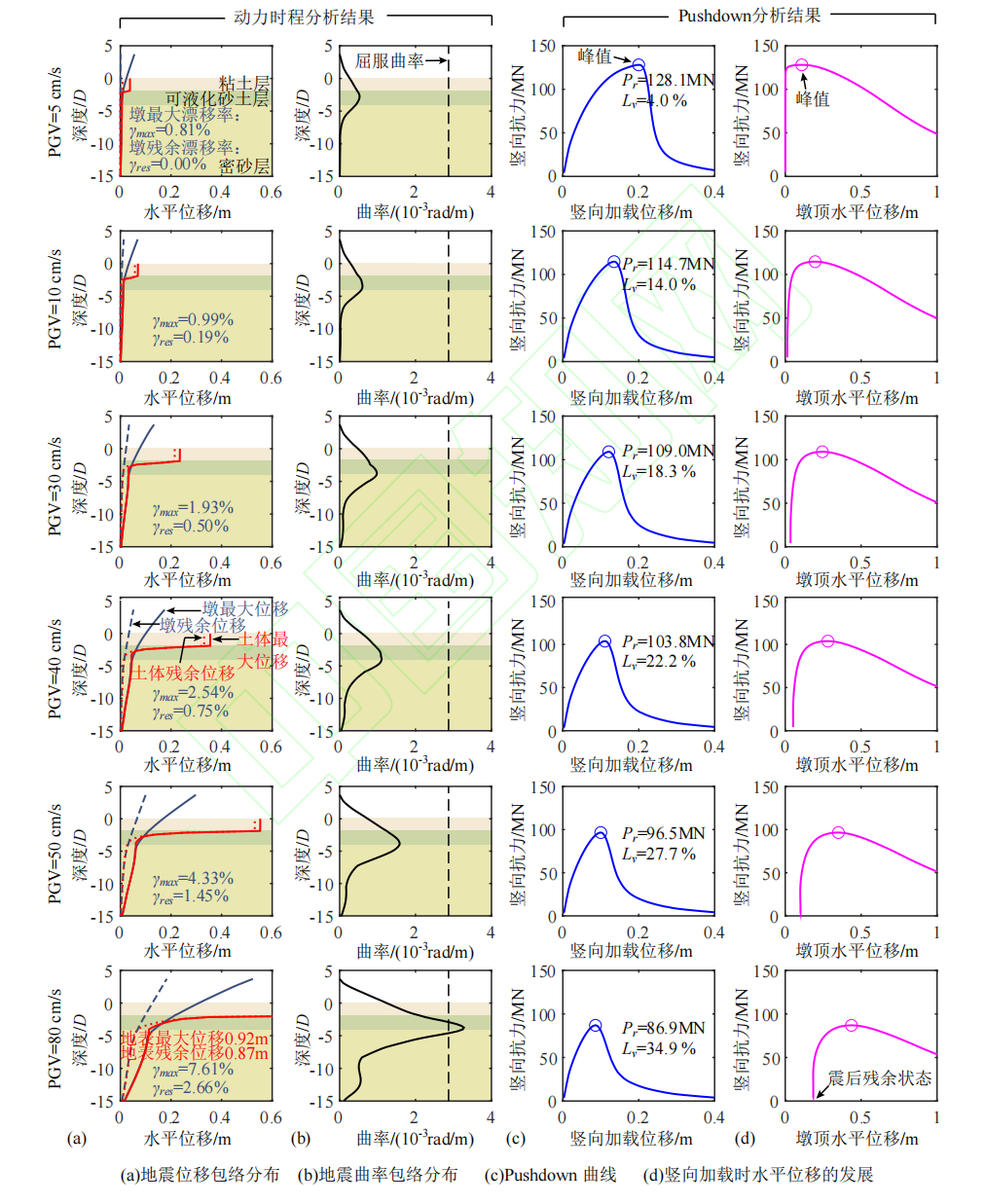 为了深入分析液化大变形场地桩柱式墩桥梁震后竖向承载能力损失的机理,图 4 给出了一个典型代表工况的完整计算结果。该工况墩柱的直径为 1.86\mathrm{m} ,墩高 6.9\mathrm{m} ,轴压比 5.3\% ,纵筋配筋率 2\% ,配箍率 0.52\% ;钢筋屈服强度、弹性模量和硬化率分别是 430.7\mathrm{MPa} 、 202.4\mathrm{GPa} 和 0.0146 ;保护层混凝土抗压强度、抗压强度对应的应变和极限应变分别是 36.3\mathrm{MPa} 、 0.003 和 0.0063 ;核心混凝土抗压强度、抗压强度对应的应变和极限应变分别是 43.6\mathrm{MPa} 、 0.0061 和 0.0176 ;土面倾角 1.7^{\circ} ,上覆粘土层厚 3\mathrm{m} ,不排水剪切强度 37.5\mathrm{kPa} ;可液化砂土层厚 4\mathrm{m} ,相对密实度 53.9\% 。地震动输入为 Loma