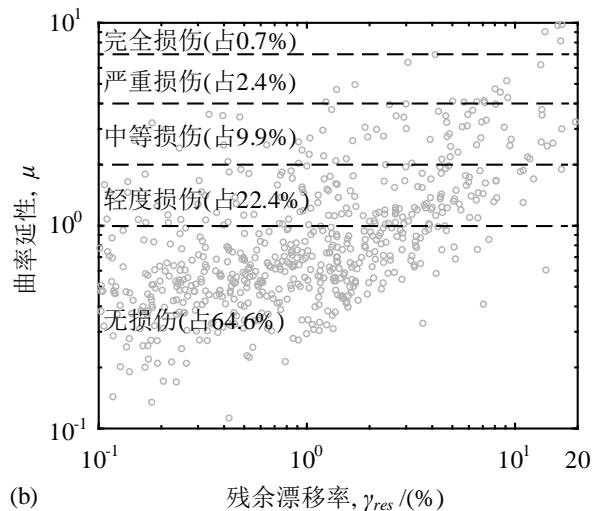 图 5 震后墩柱残余漂移率与 (a) 地表残余位移以及 (b) 墩柱曲率延性之间的关系