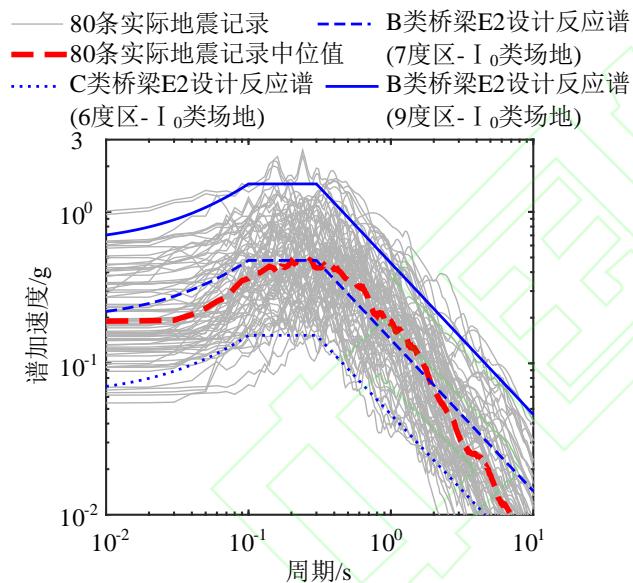 IDA 是将地震动输入调至不同强度分别对结构进行动力时程反应分析以获得结构不同程度地震损伤的分析方法。回顾 1.2 节,输入地震波应选取特征周期短、接近岩石或坚硬场地特征的地震记录,因此,本文采用 BAKER 等54选取的 80 条岩石或坚硬场地实际地震记录作为 IDA 的地震动输入,其加速度反应谱、均值谱与我国规范55 \mathrm{I}_0 类 (坚硬) 场地设计反应谱的比较如图 3 所示。80 条实际