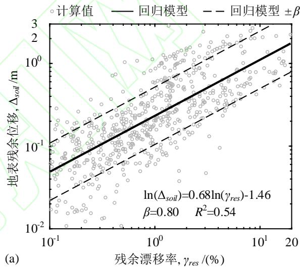 式中: \overline{L_{\nu}} 为给定桥墩残余漂移率 \gamma_{res} 下震后竖向承载能力损失的均值; \beta 为回归模型的标准差; L_{\nu i} 为第 i 个样本的桥梁震后竖向承载能力损失计算值, N 为计算样本数量。由式 (2) 可知,液化大变形场地桩柱式墩桥梁的震后竖向承载能力损失与桥墩的残余漂移率呈幂函数的关系。